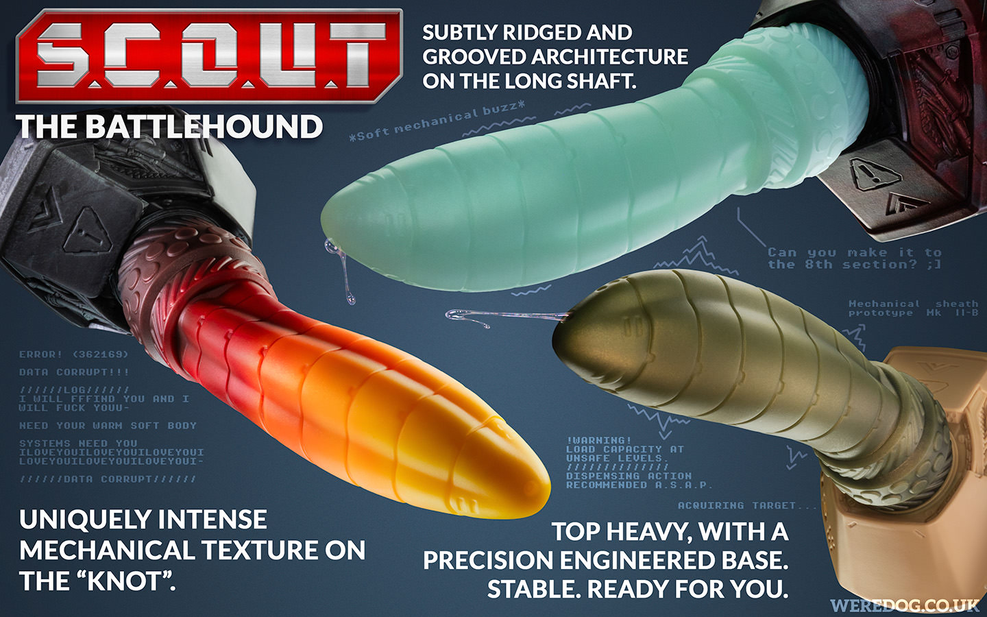 Schlick, schlick, the shaft pulsed harder, subtle, ordered veins glowing bright beneath the polymer surface. Milo’s hand slid lower, experimentally grasping the thicker portion which visibly emulated a knot, and with that Scout’s whole chassis tensed, every actuator suddenly maxed out and twitching, and–