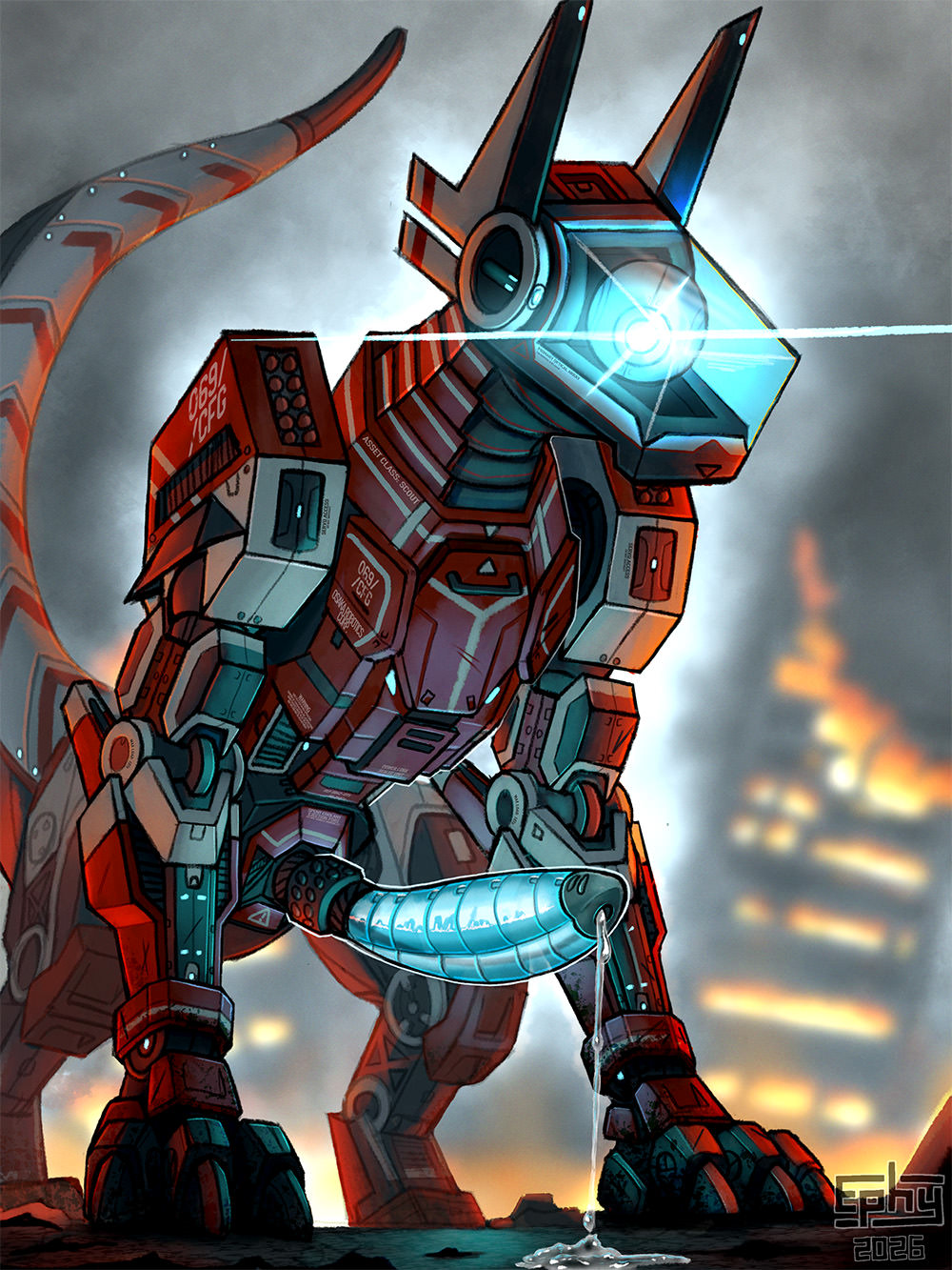 “ASSET CLASS: SCOUT” was stamped in faded block letters along the quadruped’s crimson-and-white chassis. Not the ideal model - scouts were built for speed and stealth, so didn’t carry the same salvage value as their larger counterparts - but free was free. Upgrade ports dotted the frame, some capped with blanking plates, others still holding legacy hardware. Milo rapped a knuckle against the side of the square glass visor. A solid clunk. Underneath, the optics sphere twitched on its gimbal for a split second.